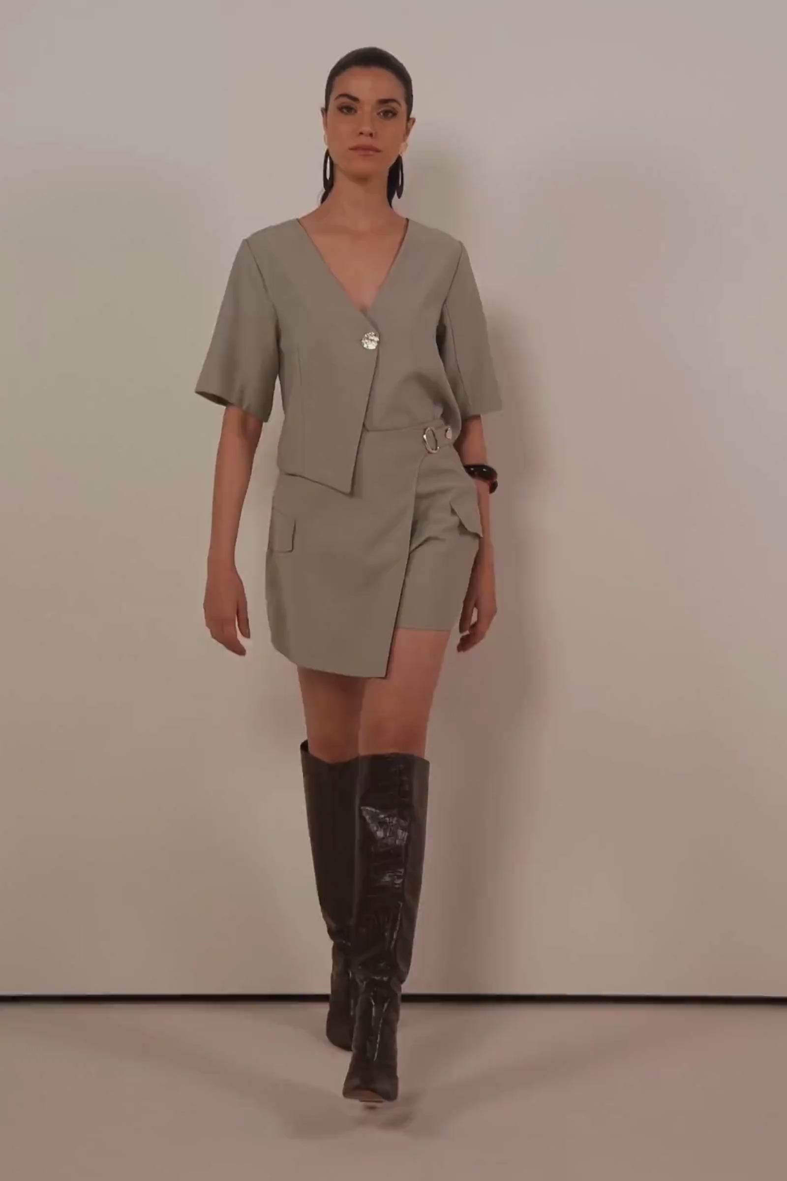 O modelo apresenta decote em ¿V¿ profundo, mangas curtas e barra assimétrica, que conferem leveza e modernidade ao visual. Como destaque, o blazer traz botão de metal orgânico, detalhe exclusivo que agrega sofisticação e diferenciação ao design.