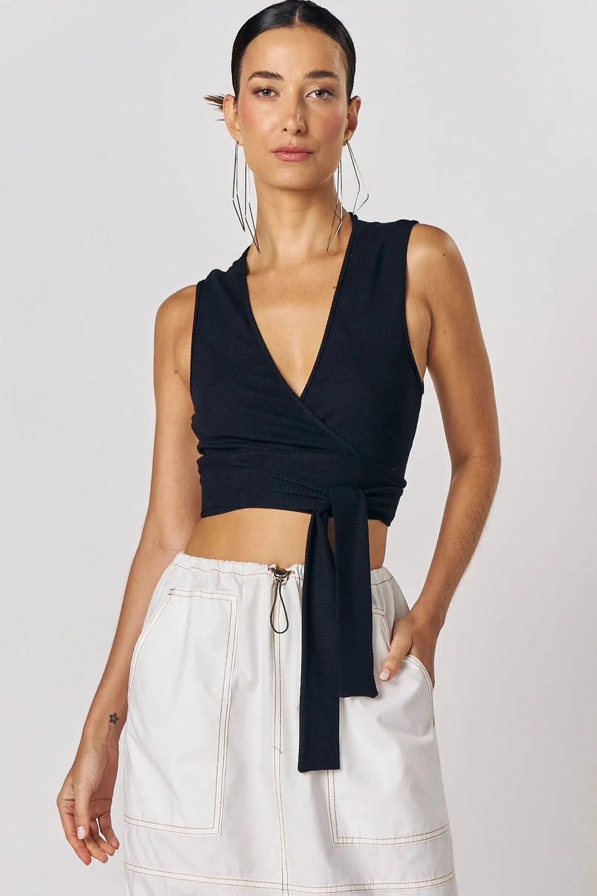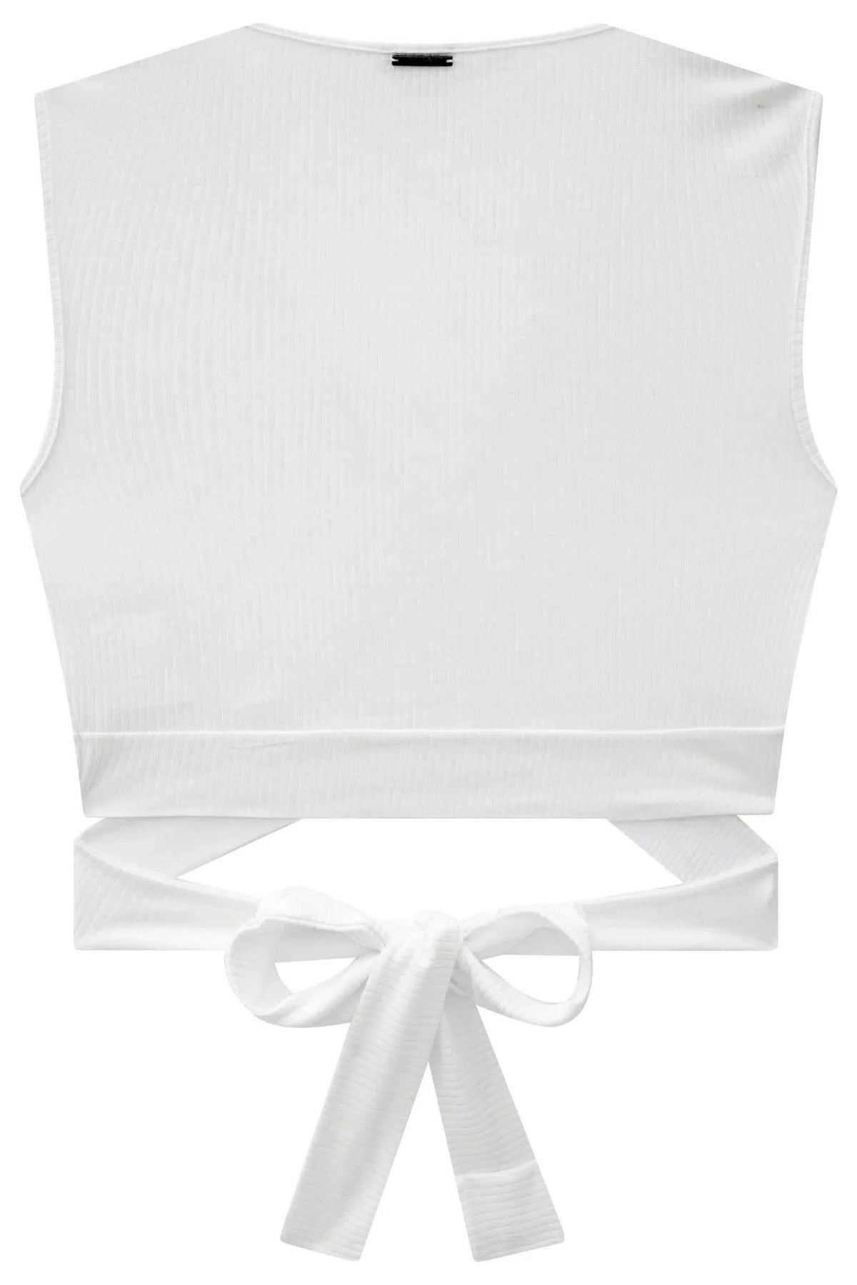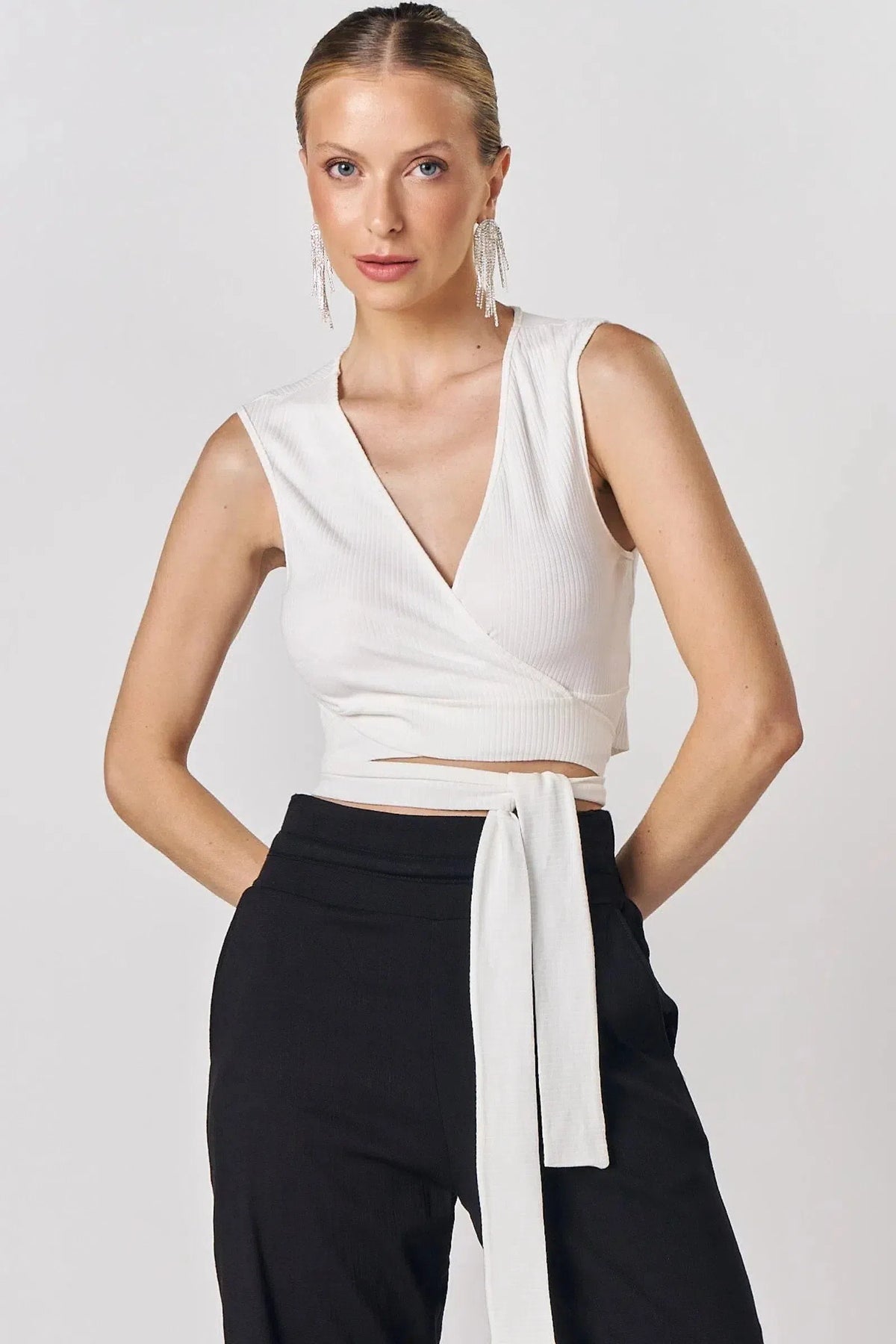 Blusa em malha canelada, com comprimento cropped, frente transpassada com sobra para regular a amarração.