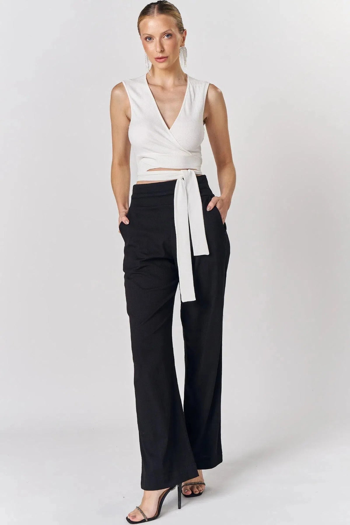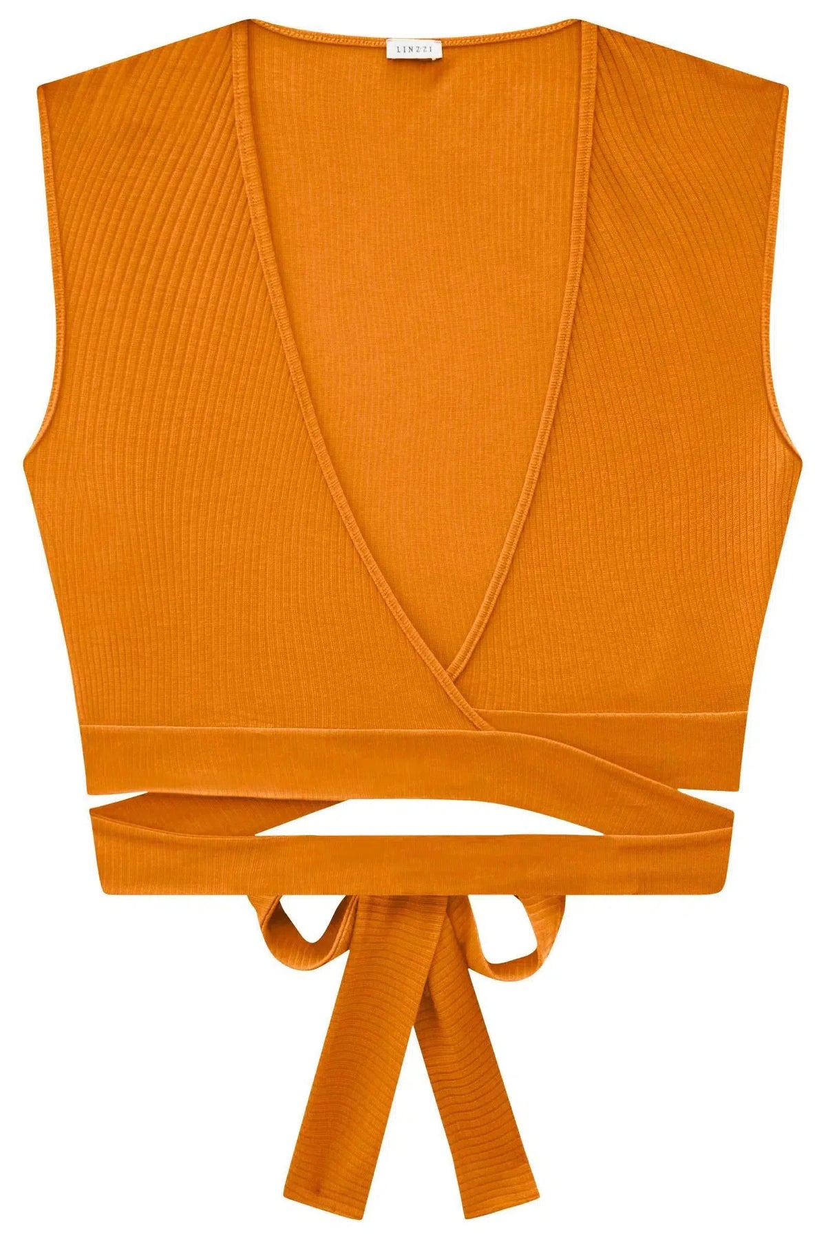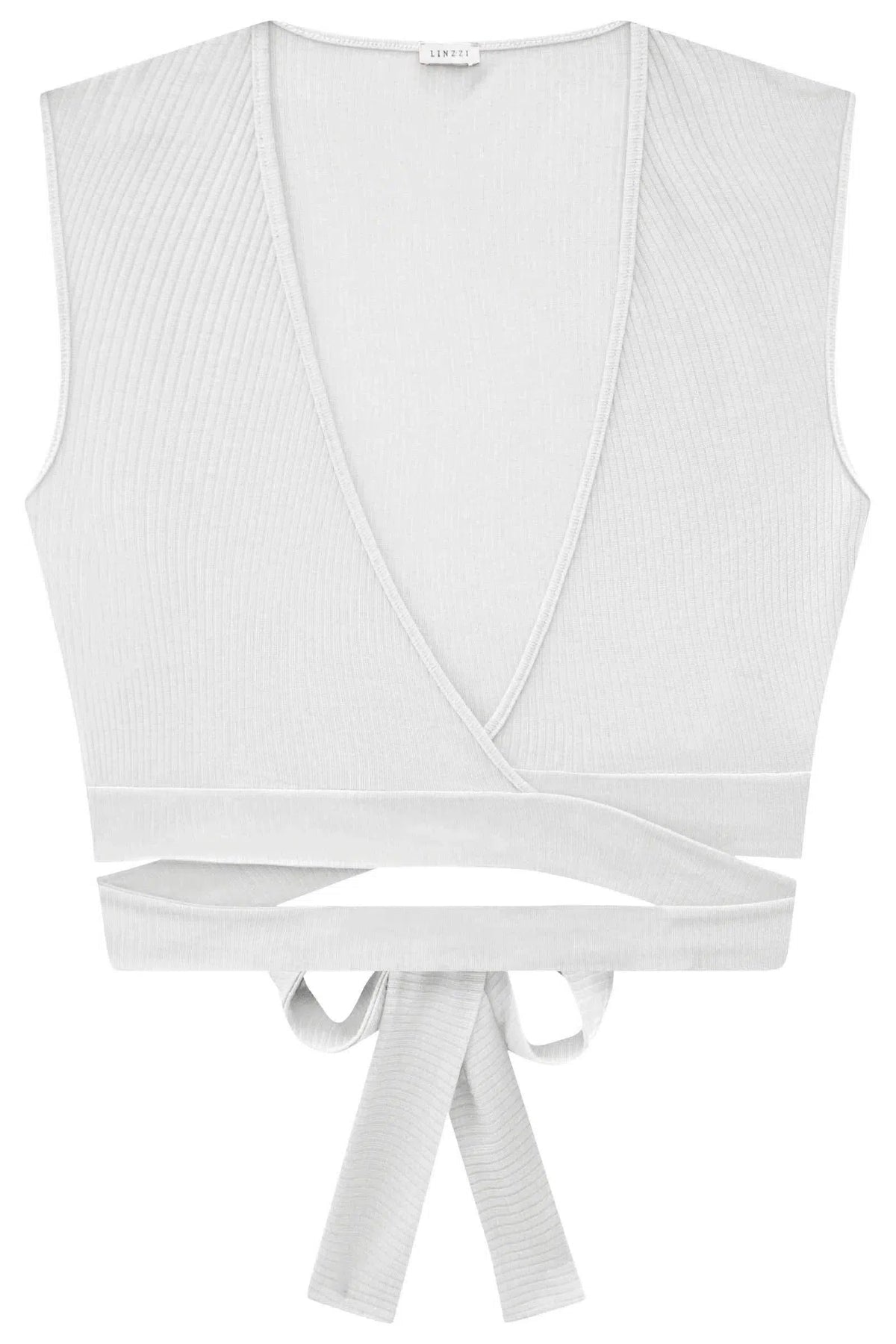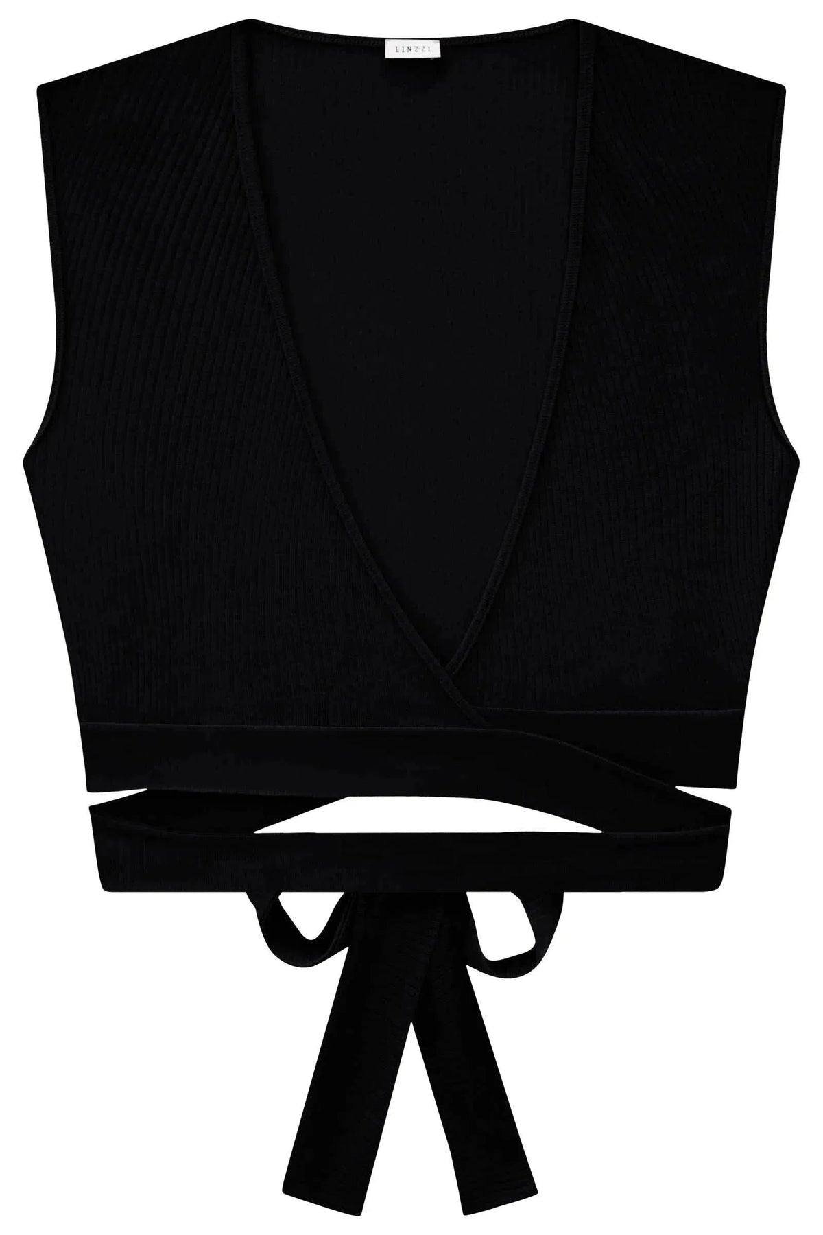 Blusa em malha canelada, com comprimento cropped, frente transpassada com sobra para regular a amarração.
