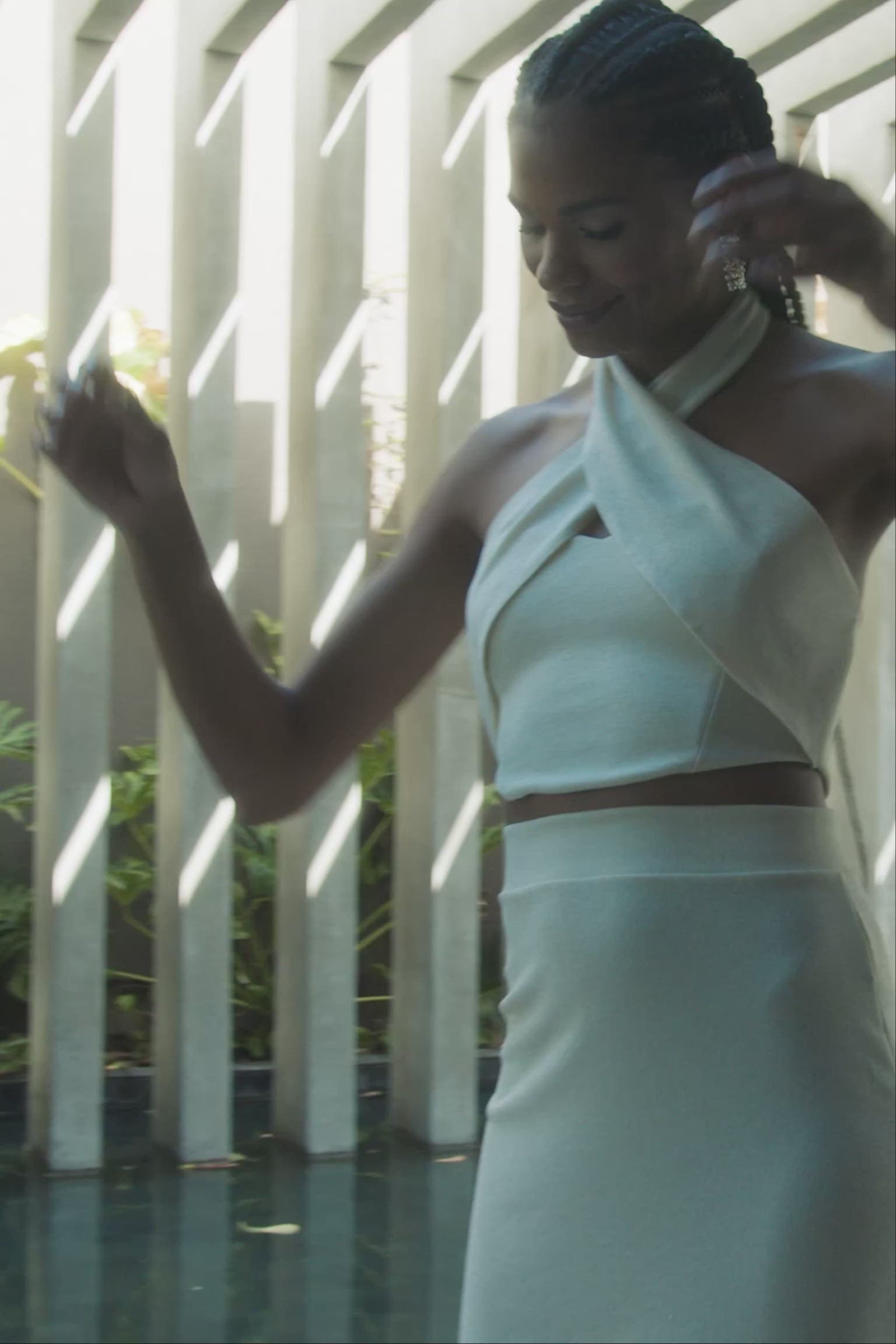 Blusa cropped com detalhe frente cruzado amarrado no pescoço. Em malha lurex.