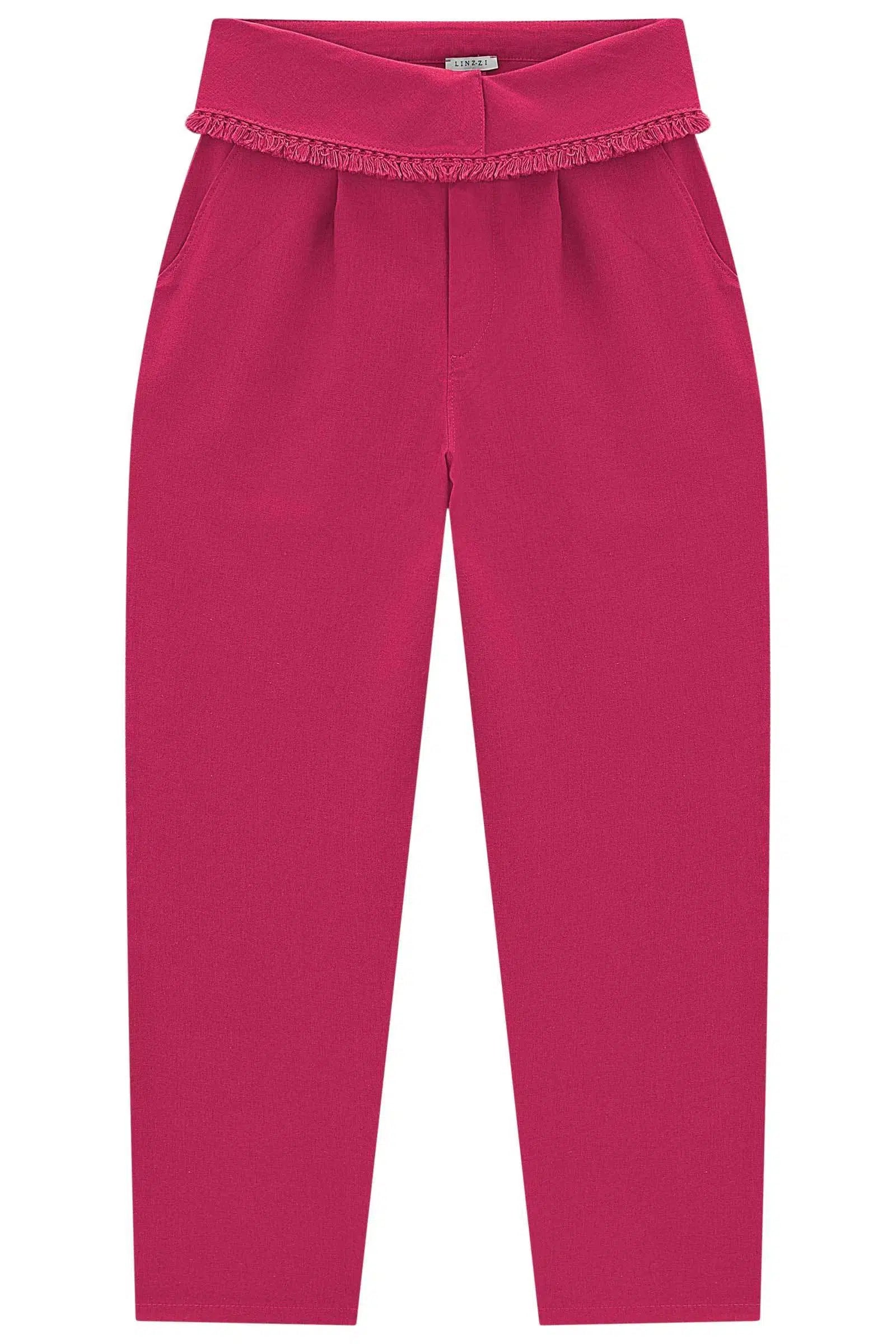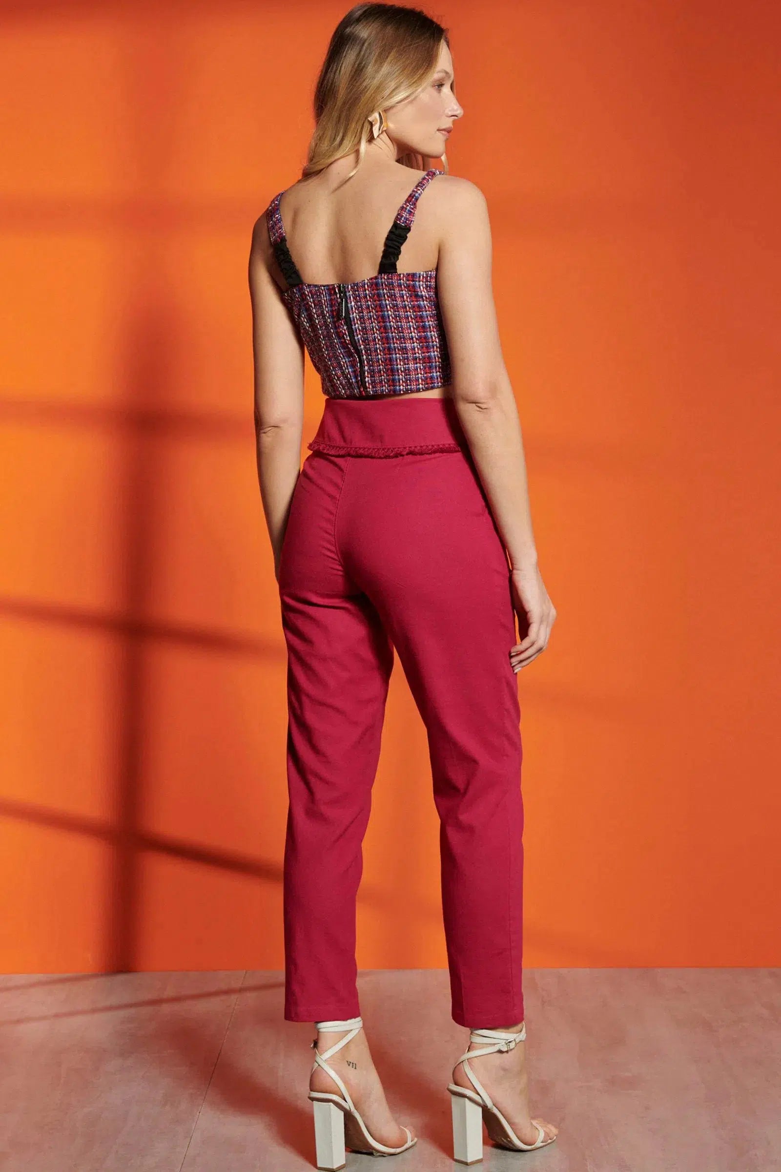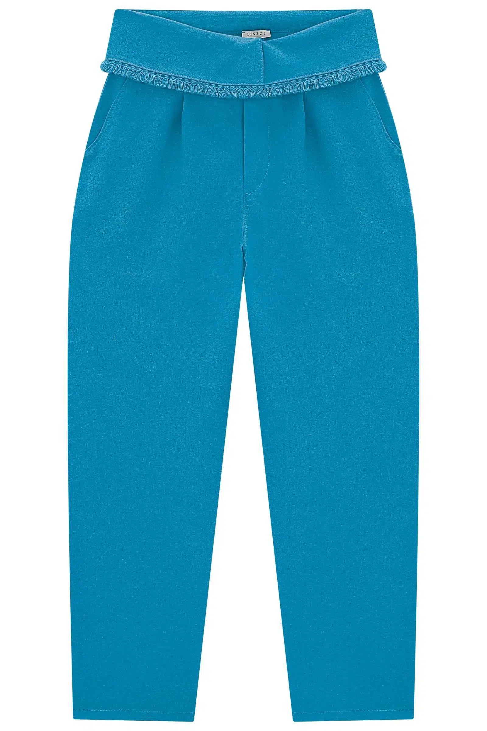 Calça cintura alta com bolso faca e levemente afunilada na barra. Cós com aba com acabamento em franjas. Em tecido blend de linho.