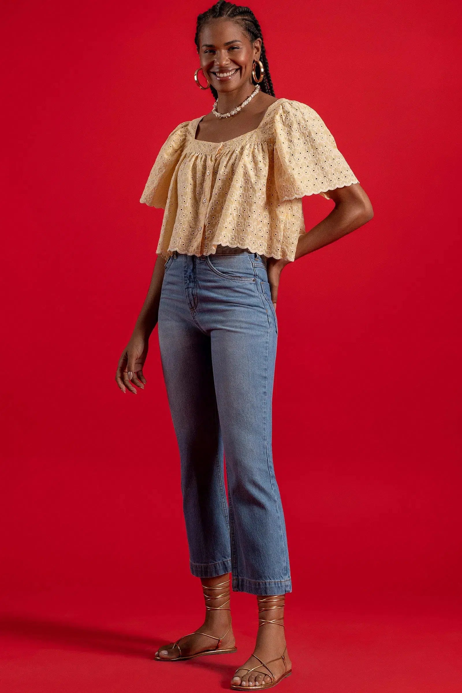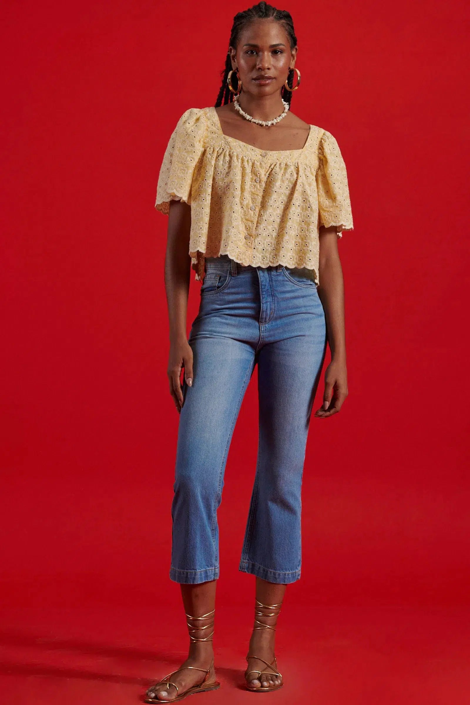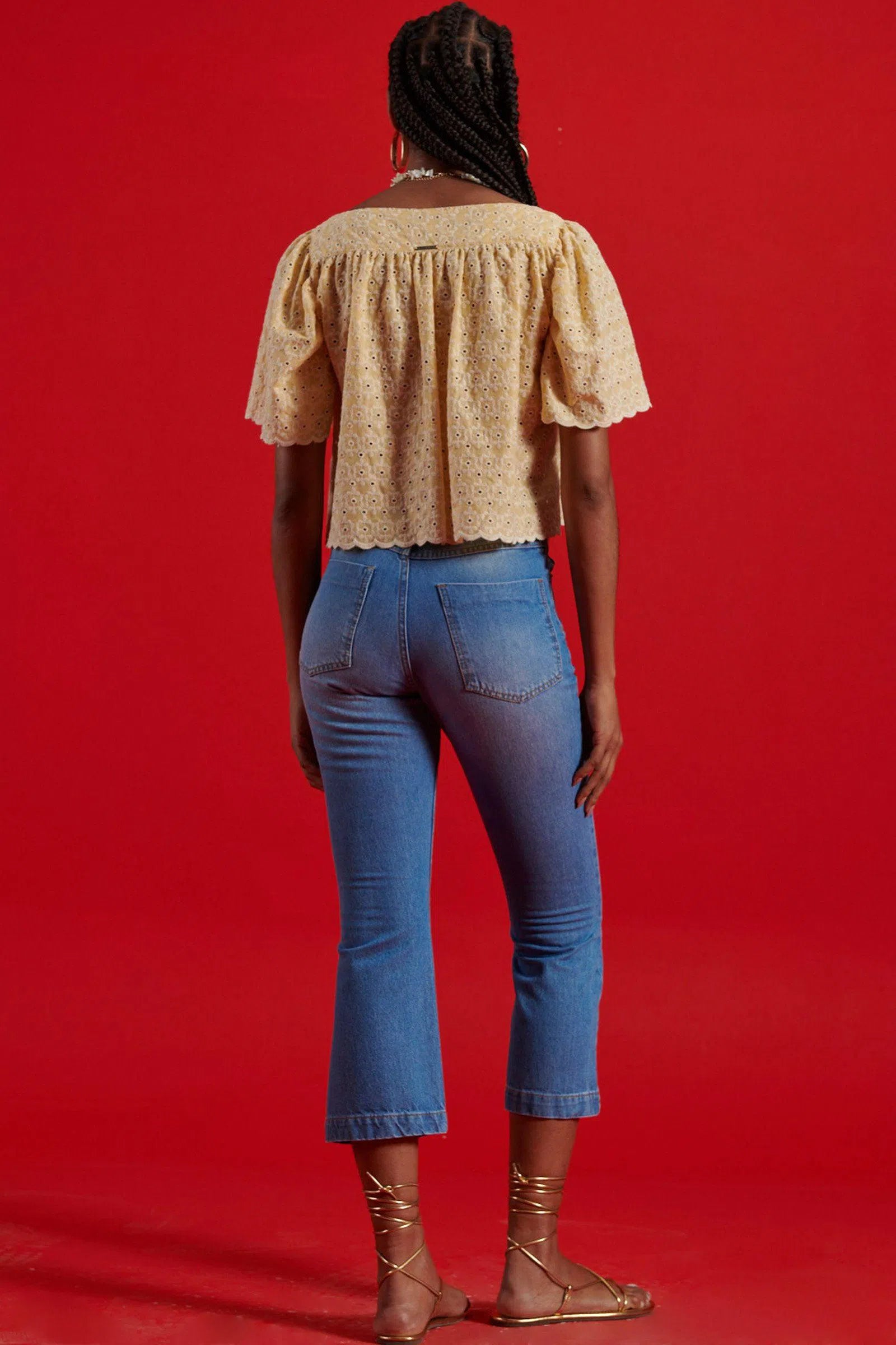 Calça cropped flare de cintura alta. Pernas levemente soltas, abrindo um pouco a partir do joelho. Comprimento na canela. Em jeans 100% algodão.