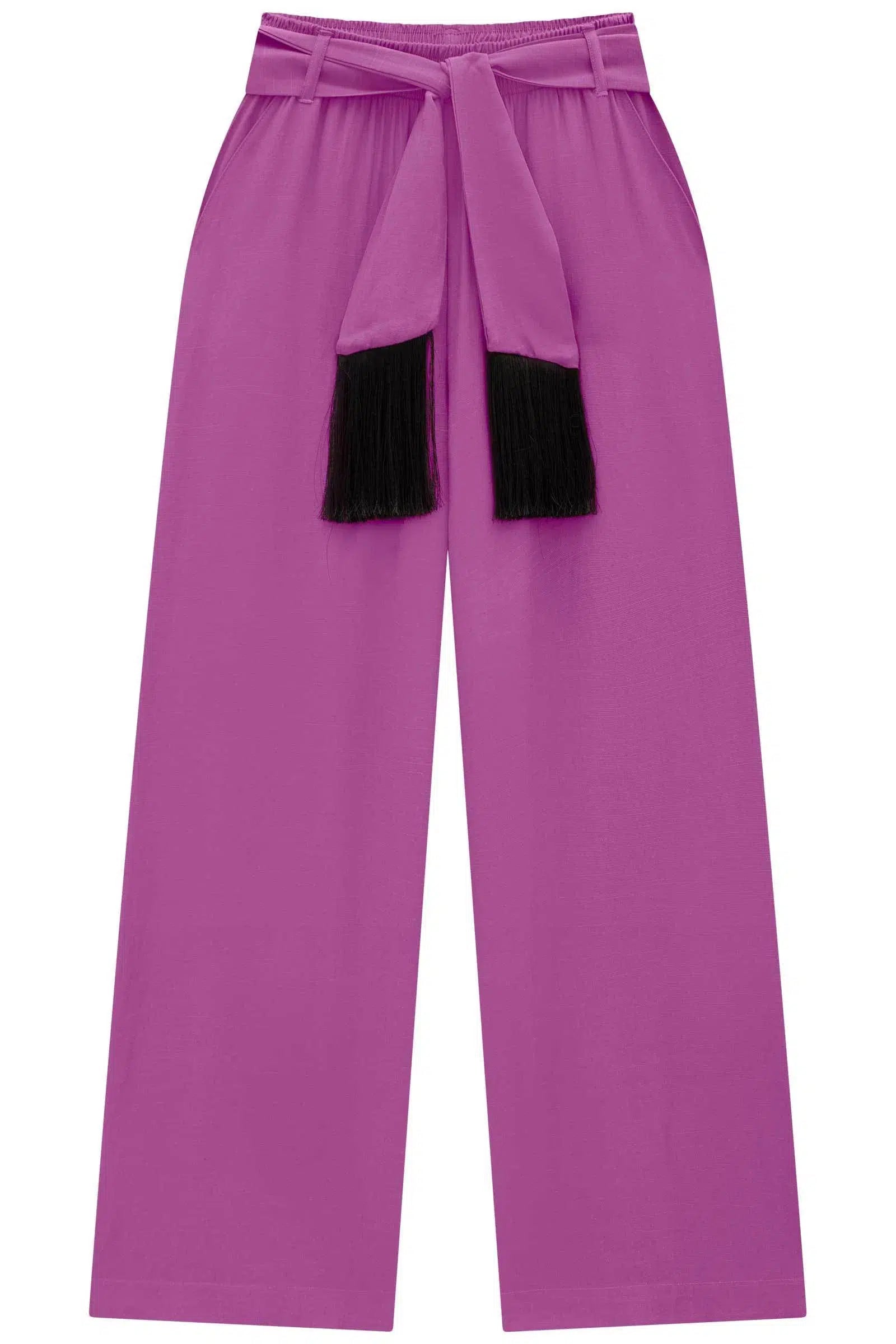 Calça wide leg cintura alta com elástico no cós. Pernas super amplas e faixa de tecido com franjas para amarrar. Bolsos faca frontais e bolsos embutidos decorativos nas costas. Em crepe de viscose.