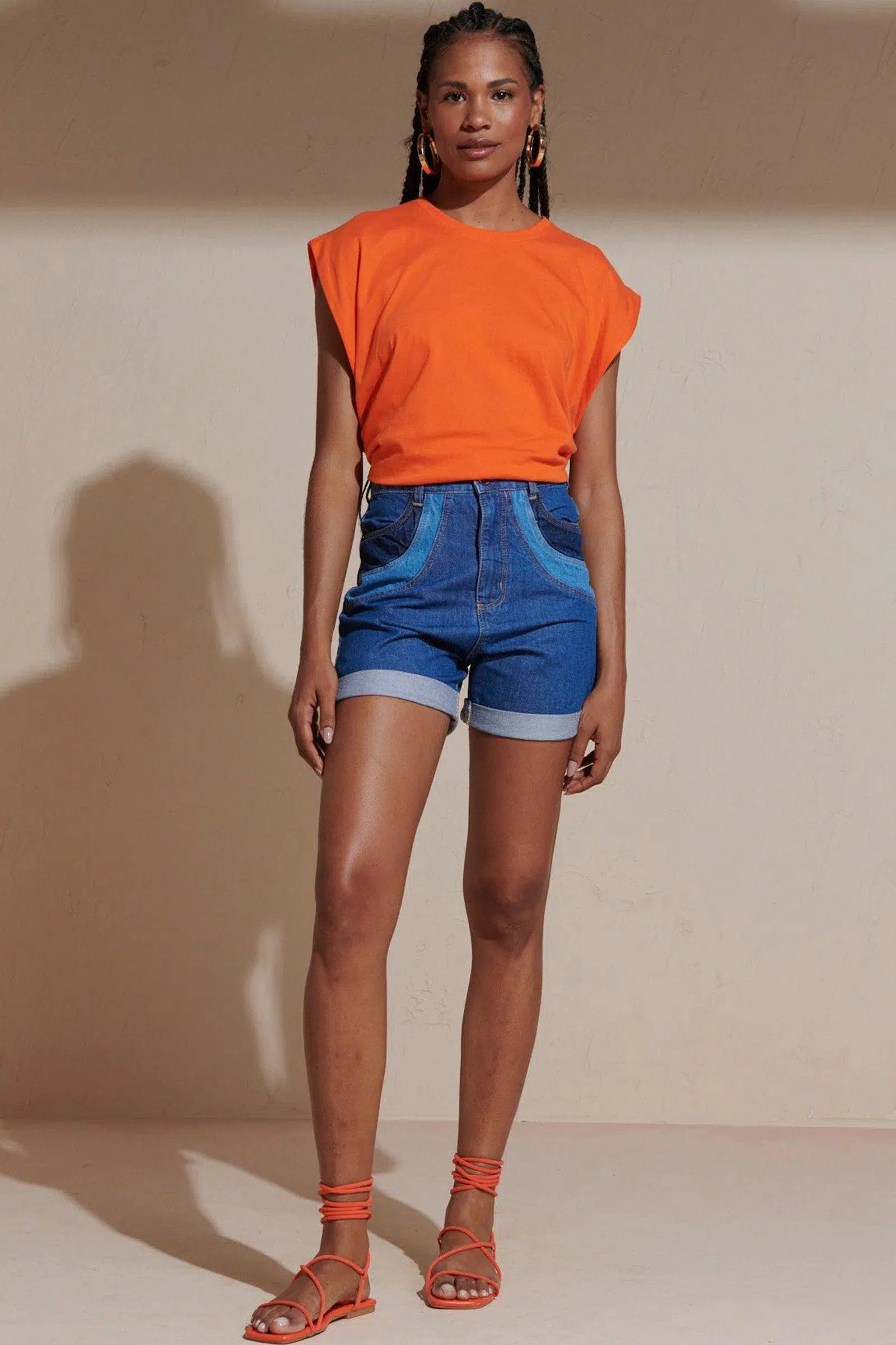 Bermuda cintura alta, veste certa ao corpo. Recortes em jeans de diferentes tonalidades na frente e nos bolsos traseiros. Barra dobrada. Em jeans 100% algodão.