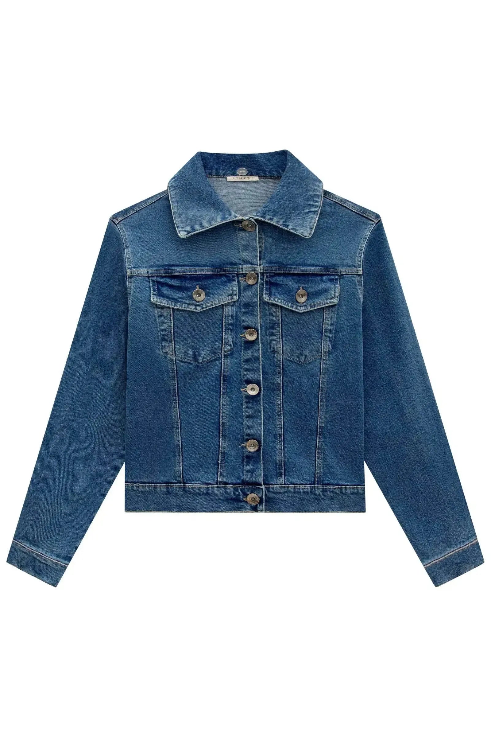 Jaqueta manga longa, possui bolsos frontais, abertura frente e punhos por botões, e gola de pelo removível. Em tecido Jeans com elastano.