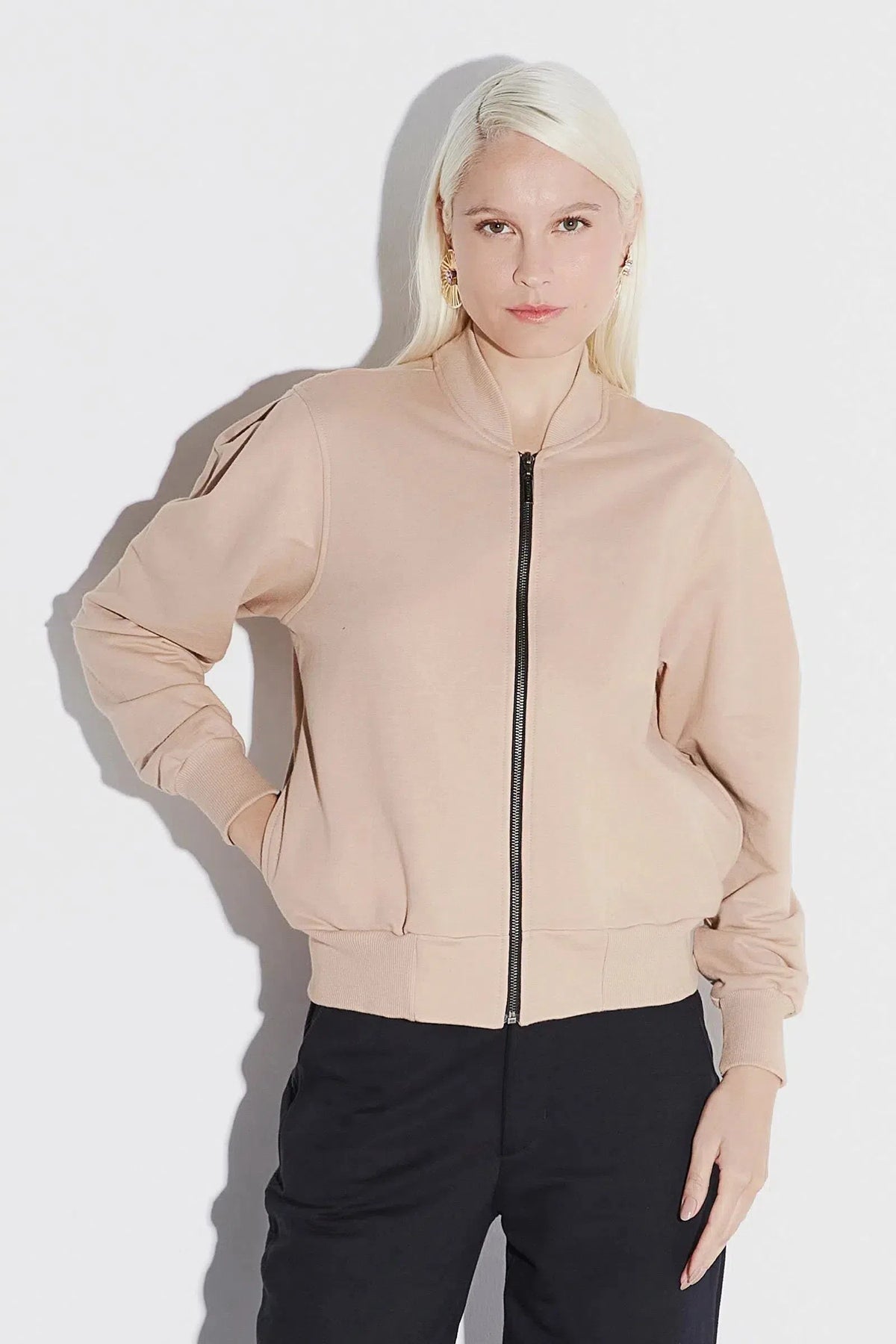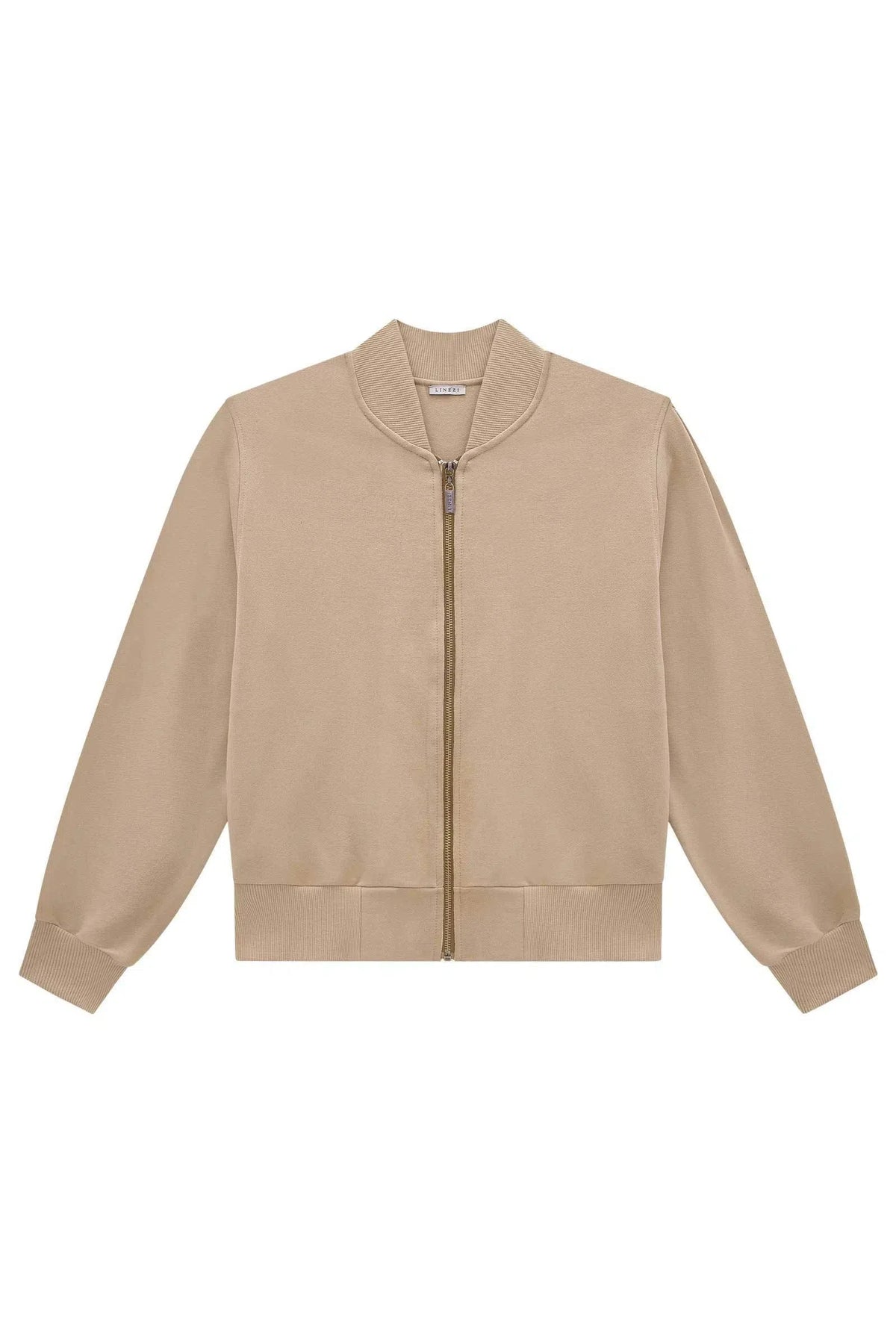 Jaqueta gola careca, com abertura frontal com zíper destacável. Mangas com pregas. Gola, punhos e cós em ribana. Em malha moletom.