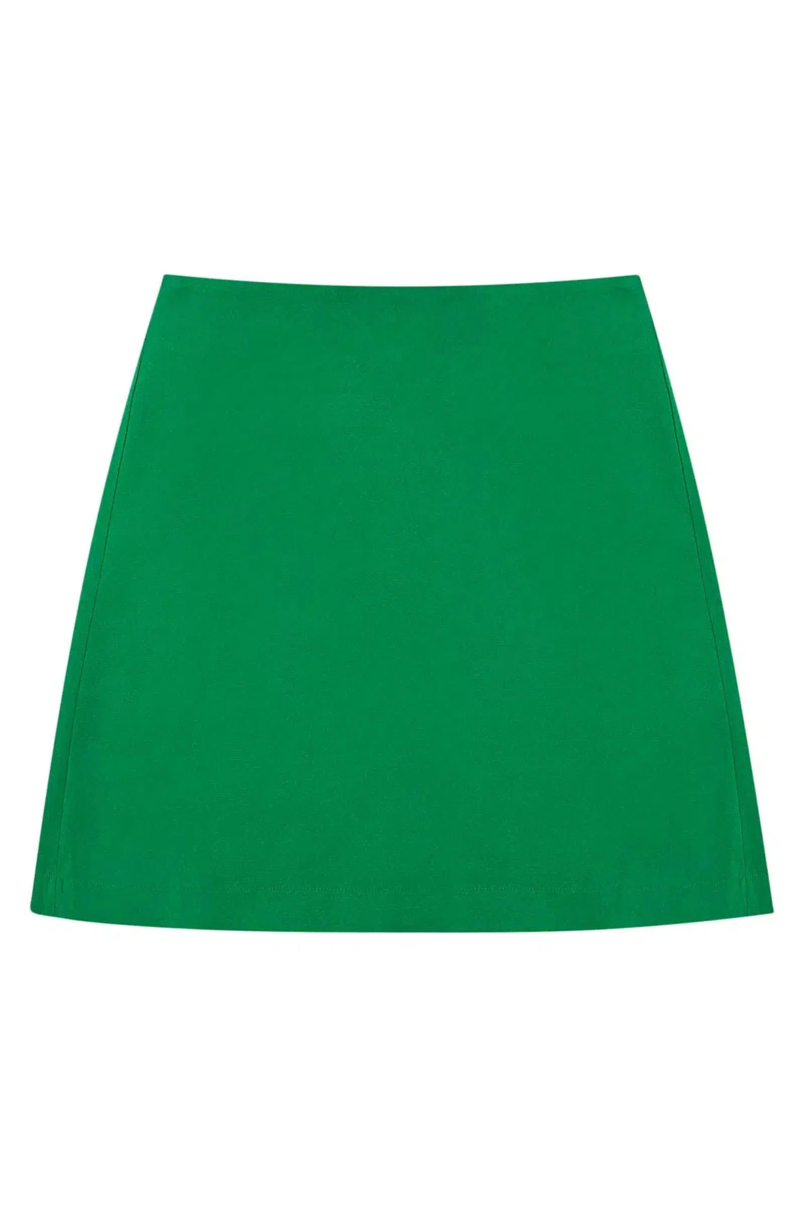 Minissaia cintura alta com barra levemente evasê. Zíper no recorte costas. Em tecido de alfaiataria.