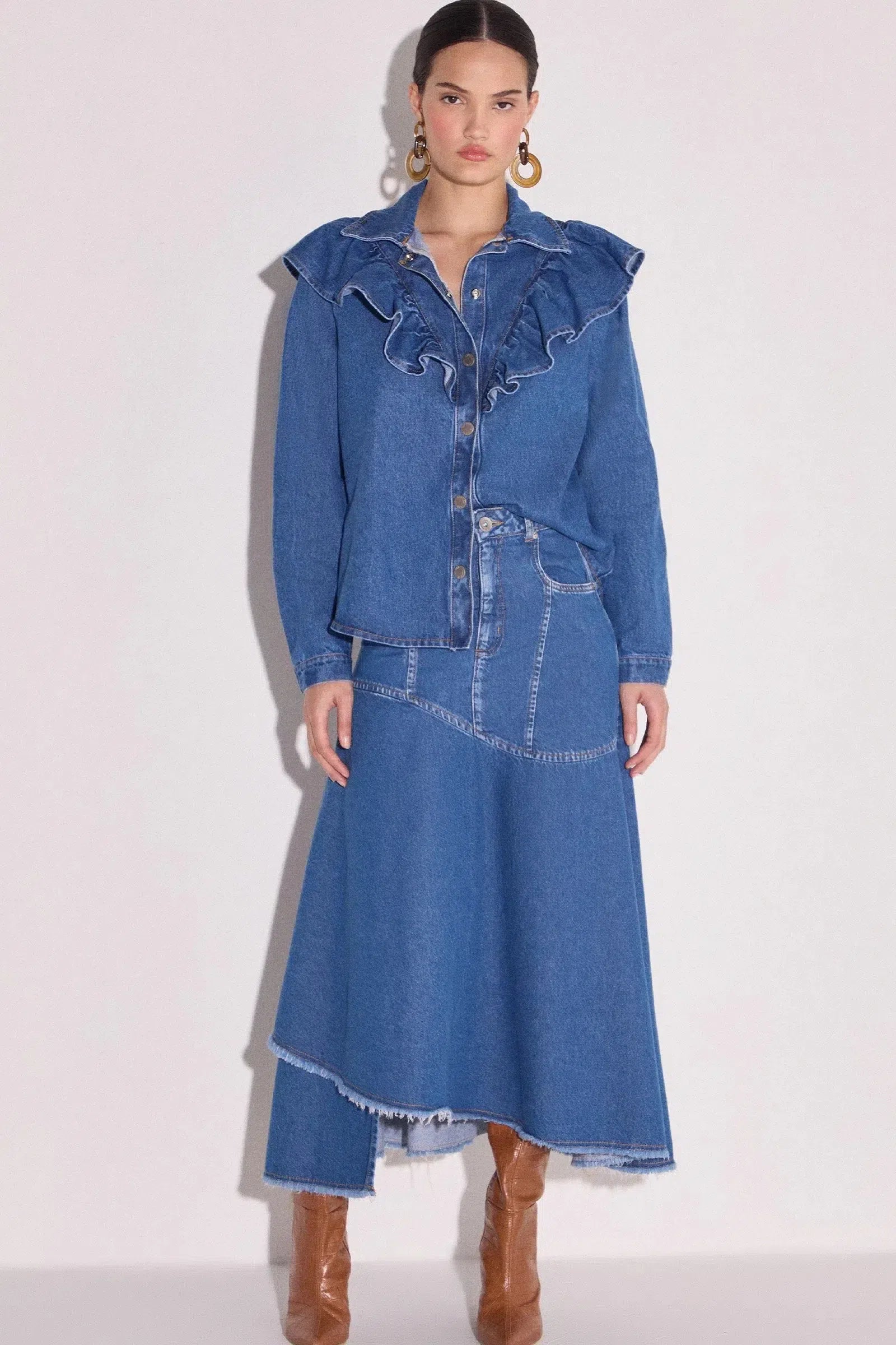 Saia com modelagem maxi midi, perfeita para utilizar com botas de cano médio e alto, confeccionada em denim. Possui detalhe de recortes frontais com babado assimétricos. Bolsos funcionais. O modelo super moderno é perfeito para combinações com outras peças da Linha Denim Linzzi.