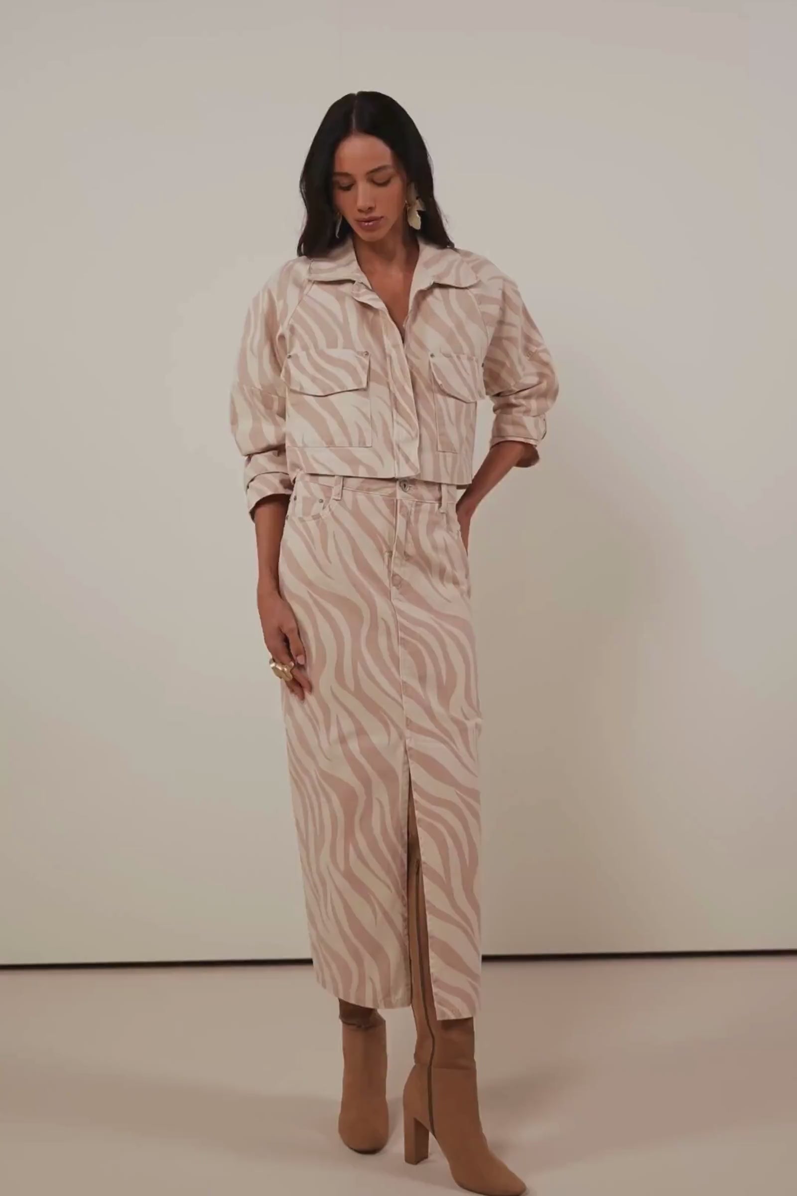 Saia Maxi Midi em Sarja Estampada A Saia Linzzi é uma peça statement da coleção Inverno 26, perfeita para quem busca elegância com atitude. Produzida em sarja estruturada com estampa exclusiva, ela combina o toque contemporâneo da alfaiataria com o charme natural da modelagem feminina. Com comprimento maxi midi e fenda frontal, a peça proporciona movimento e leveza, valorizando a silhueta de forma sofisticada. O cós alto e o caimento reto alongam a figura, enquanto o tecido encorpado garante conforto e um visual impecável. Combine com a jaqueta Linzzi ref. 93534 para um look coordenado e moderno, ideal para ocasiões urbanas e produções elegantes de inverno.
