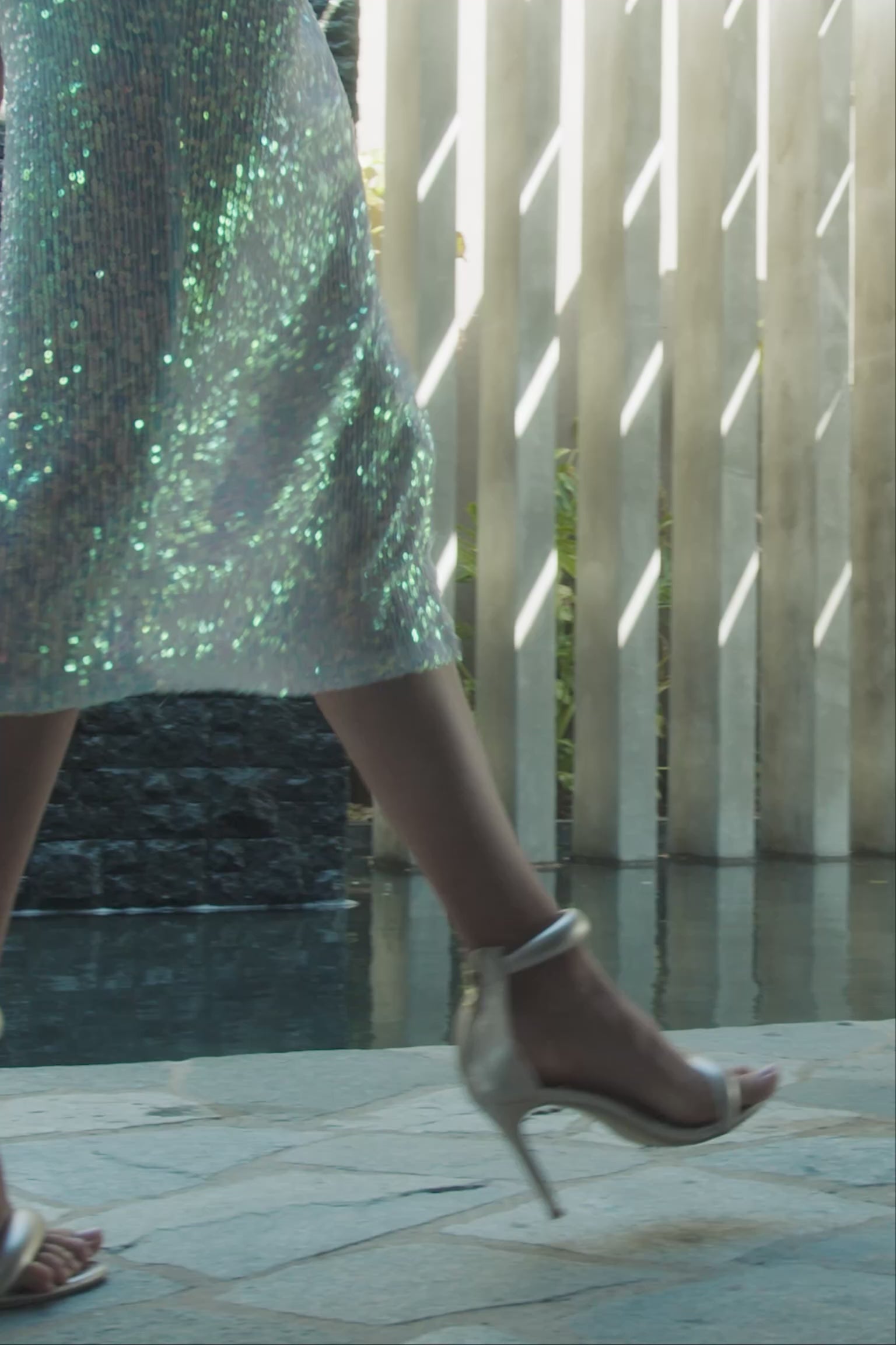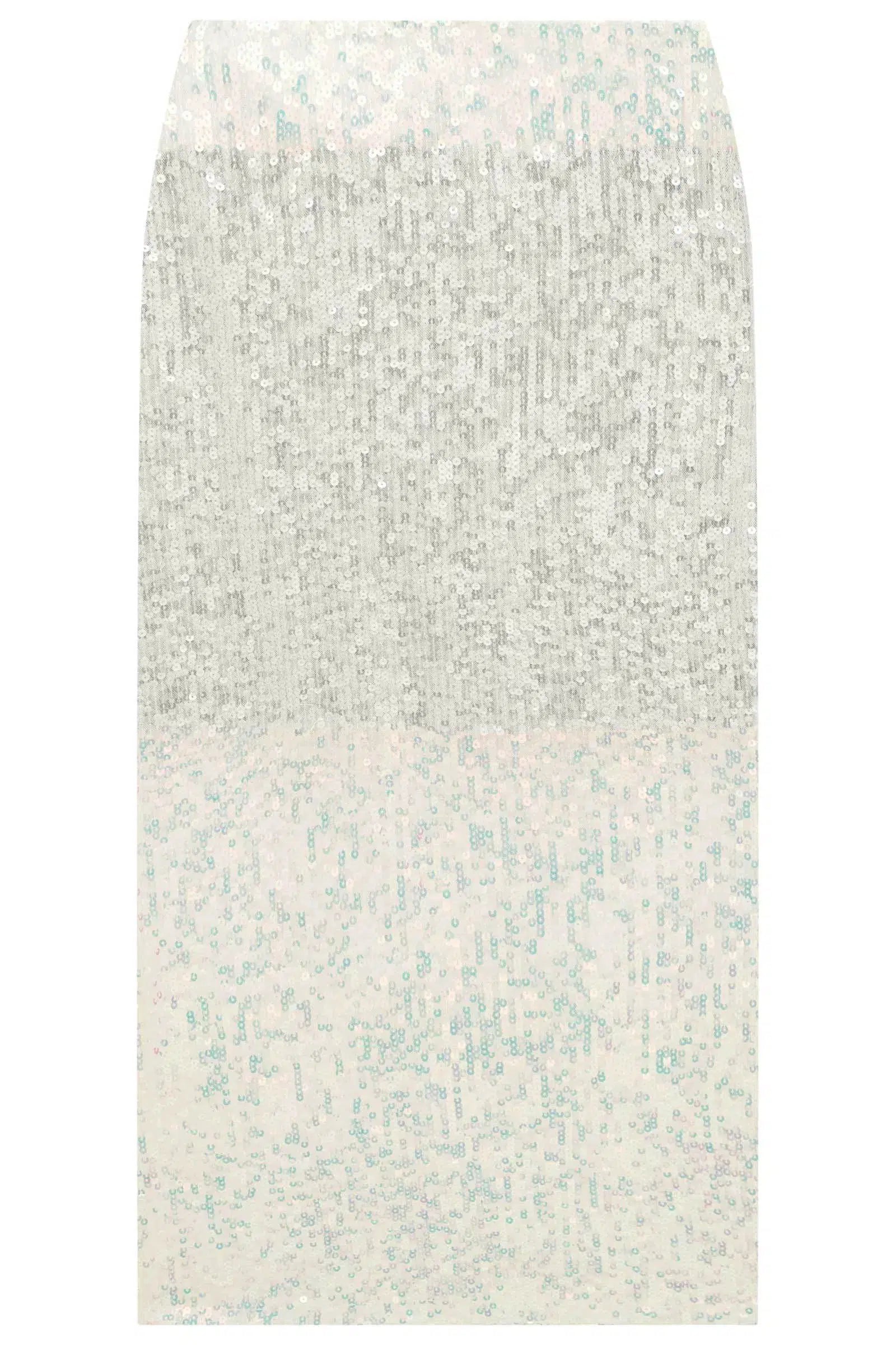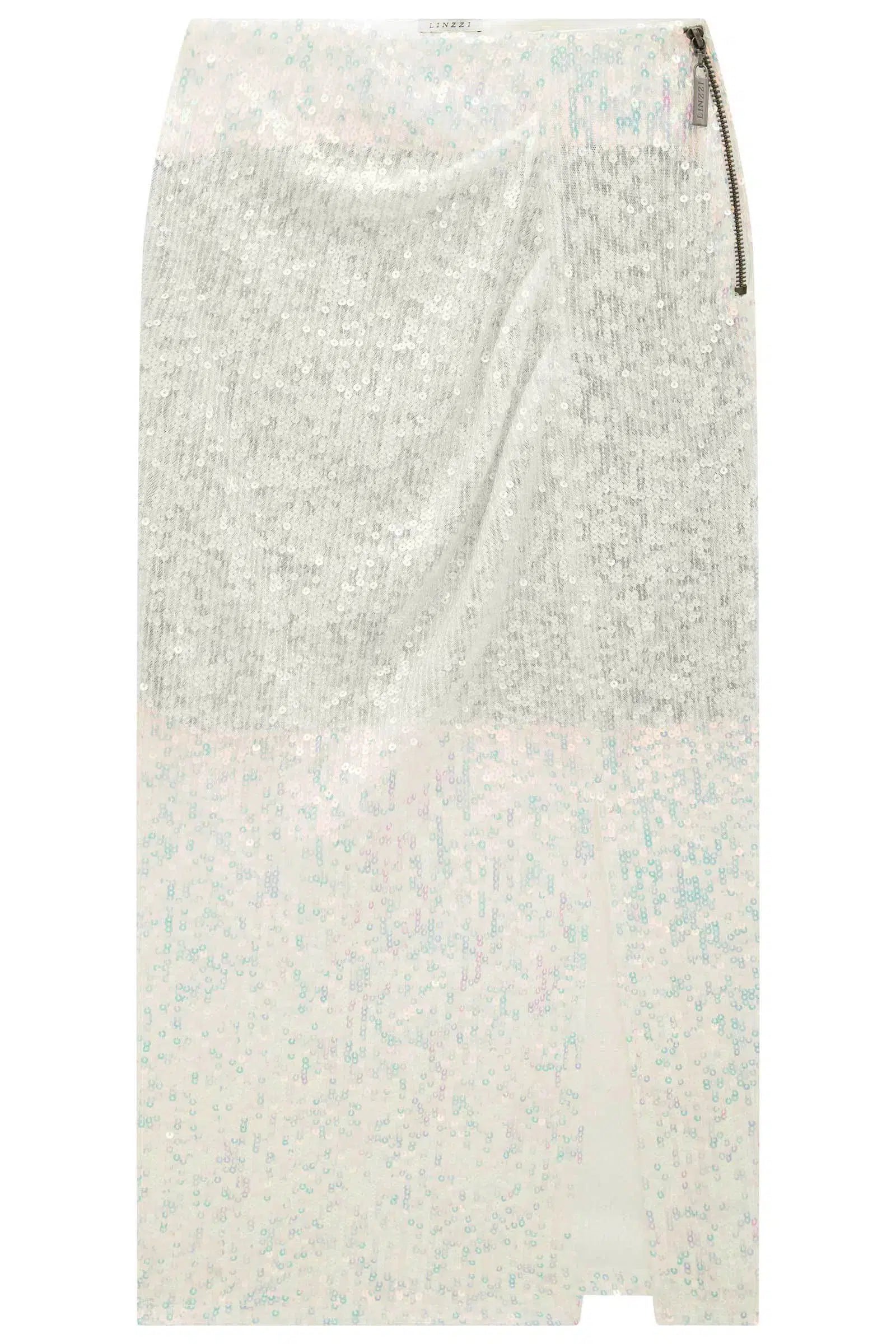 Saia mídi, recorte frente com pregas e fenda. Abertura lateral com zíper de metal. Em tecido de paetês.
