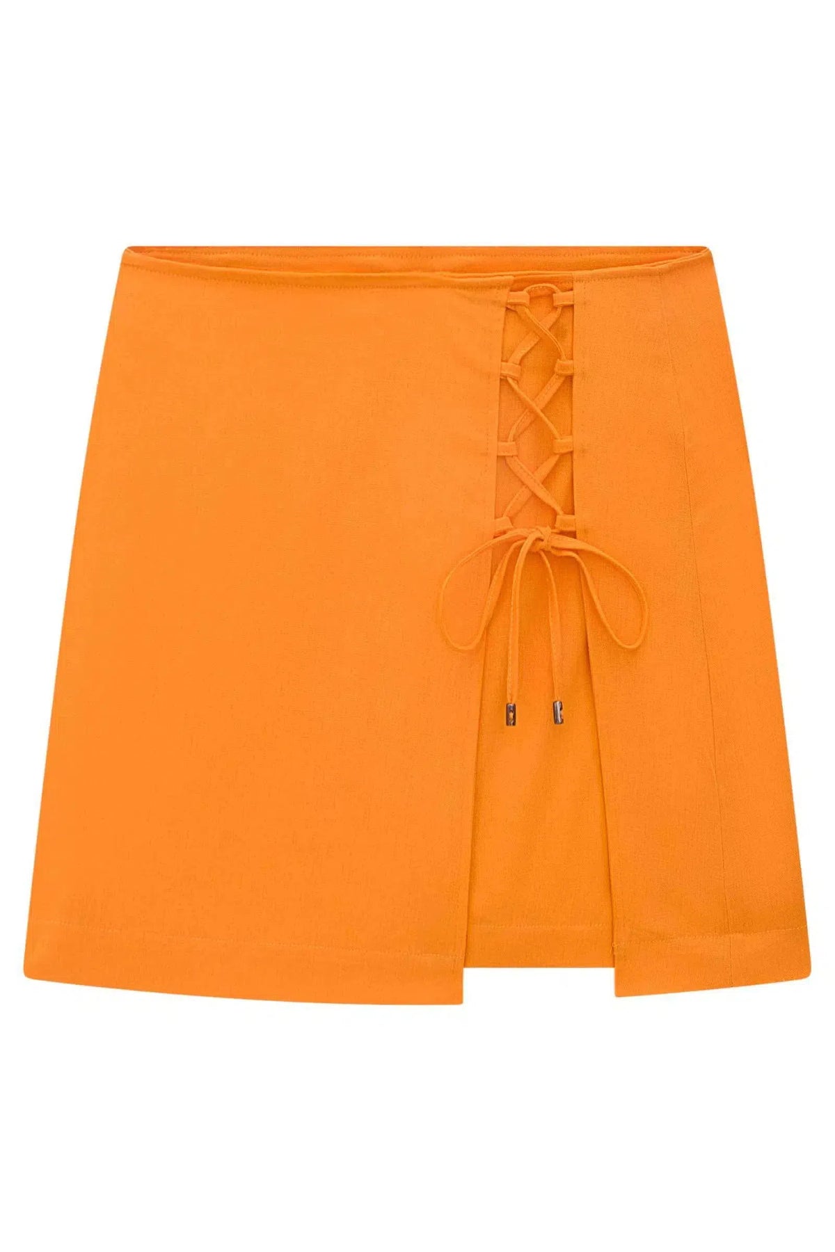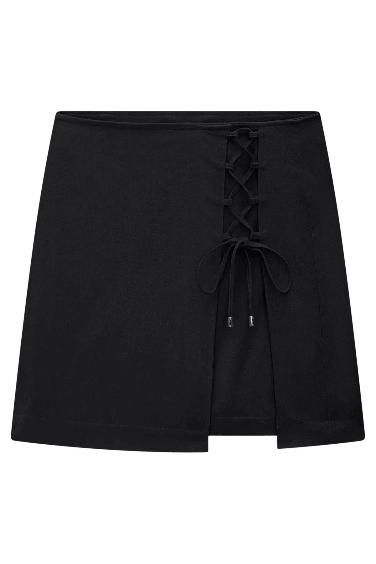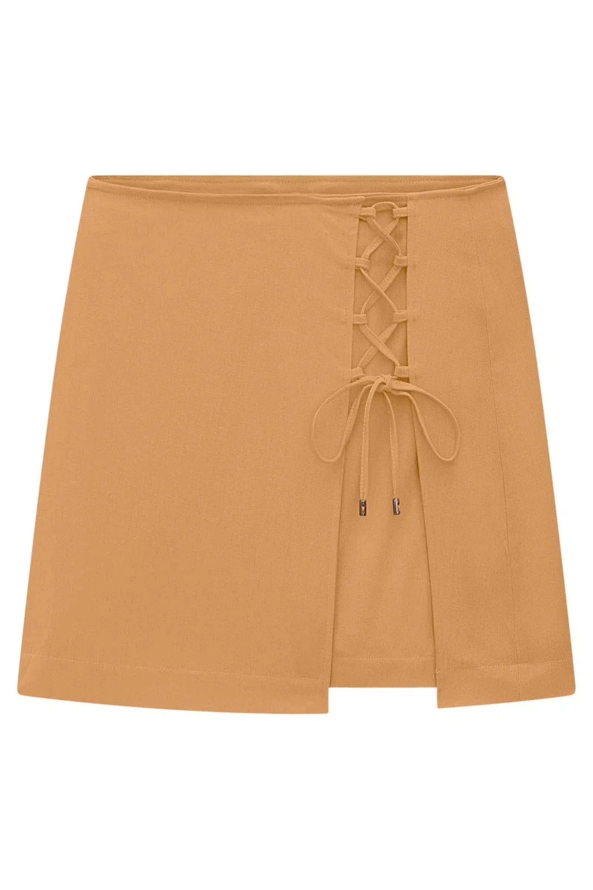 Shorts saia com modelagem de cintura alta em blend de linho. Peça possui zíper invisível na lateral, detalhe de amarração e acabamento de ponteira de metal.