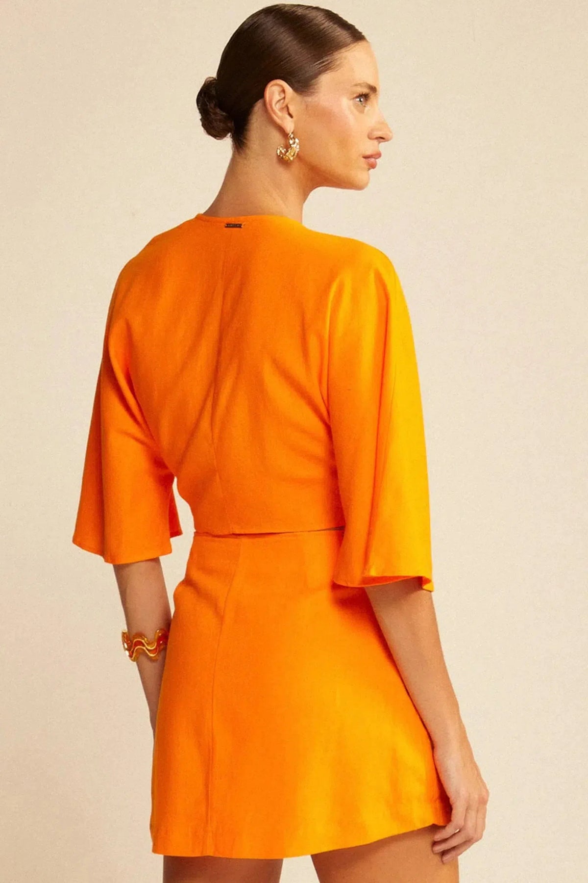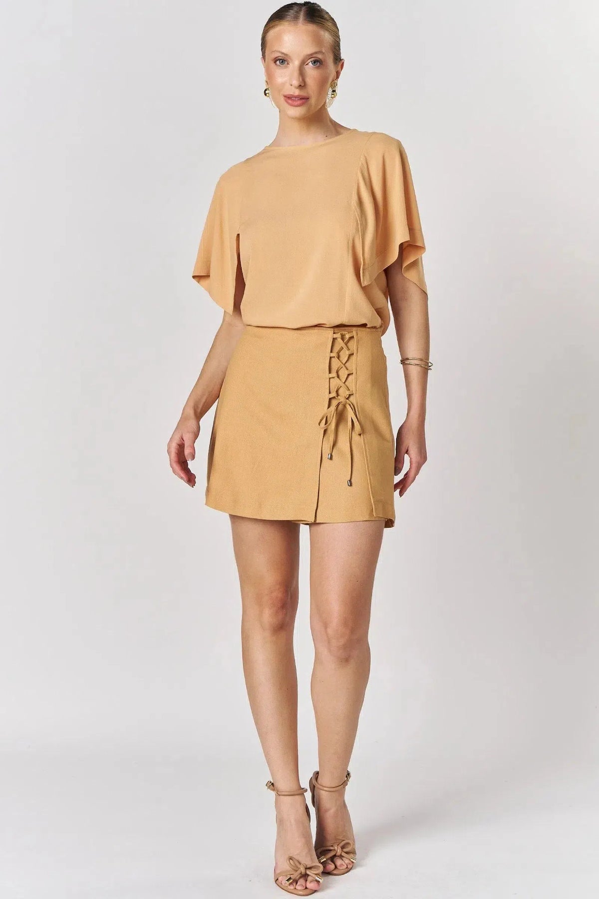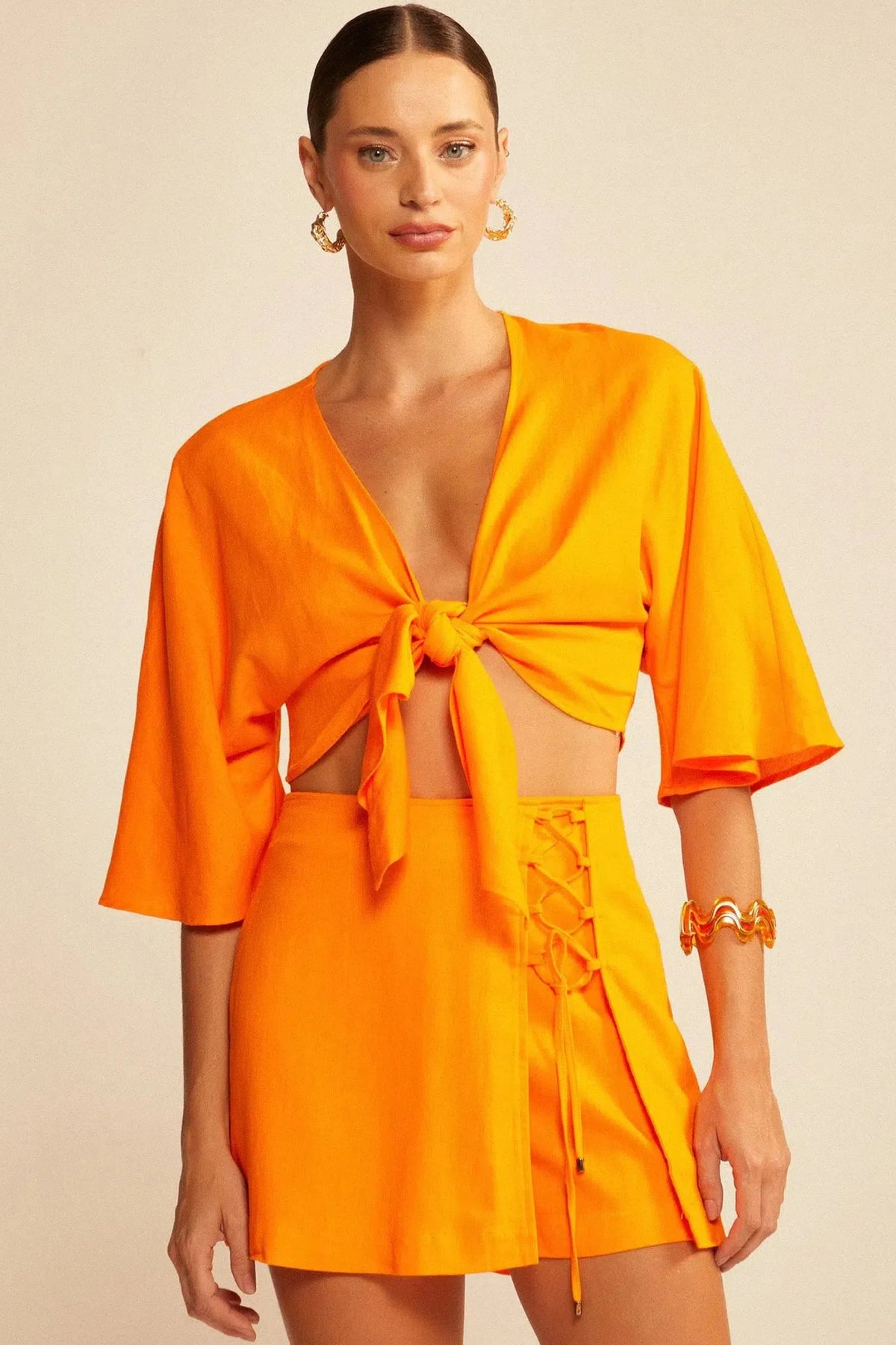 Shorts saia com modelagem de cintura alta em blend de linho. Peça possui zíper invisível na lateral, detalhe de amarração e acabamento de ponteira de metal.